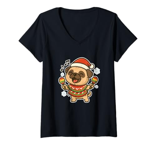 Womens Christmas Pug with Maracas V-Neck T-Shirt