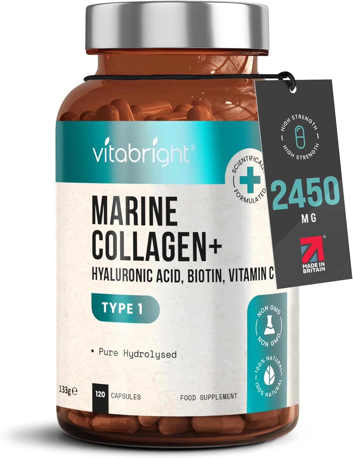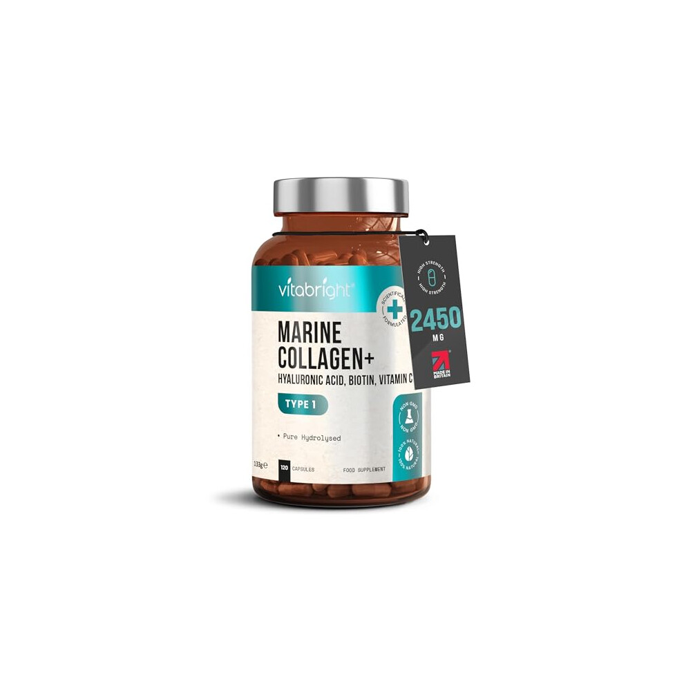 Pure Marine Collagen Capsules With Hyaluronic Acid Vitamin C, 2450mg 120 Collagen Tablets High Strength Hydrolysed Marine Collagen Peptides Powder, V