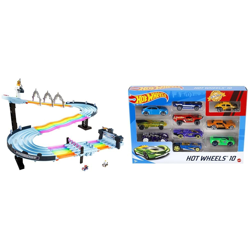 Hot Wheels Mario Kart Rainbow Road Raceway 8-Foot Track Set with Lights & Sounds & 2 1:64 Scale & Toy Cars & Trucks in 1:64 Scale, Set of 10, Multipac