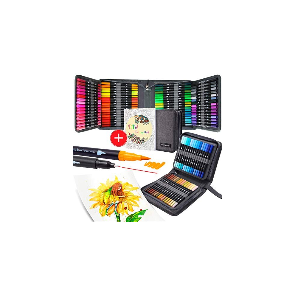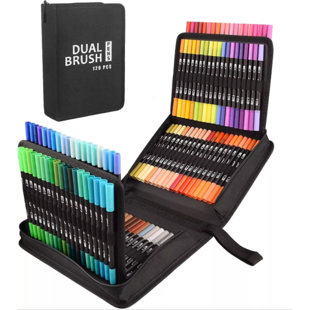120 Colors Dual Tip Colouring Pens Brush Pens Fineliners Art Markers, Watercolor Marker and Highlighters with Canvas Bag for Adult Coloring Books