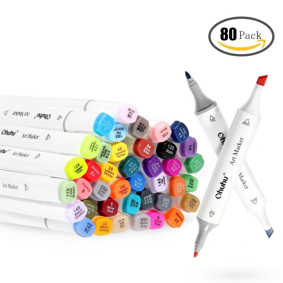 Ohuhu 80 Colors Dual Tips Art Sketch Twin Marker Pens Highlighters with Carrying Case for Painting Coloring Highlighting and Underlining