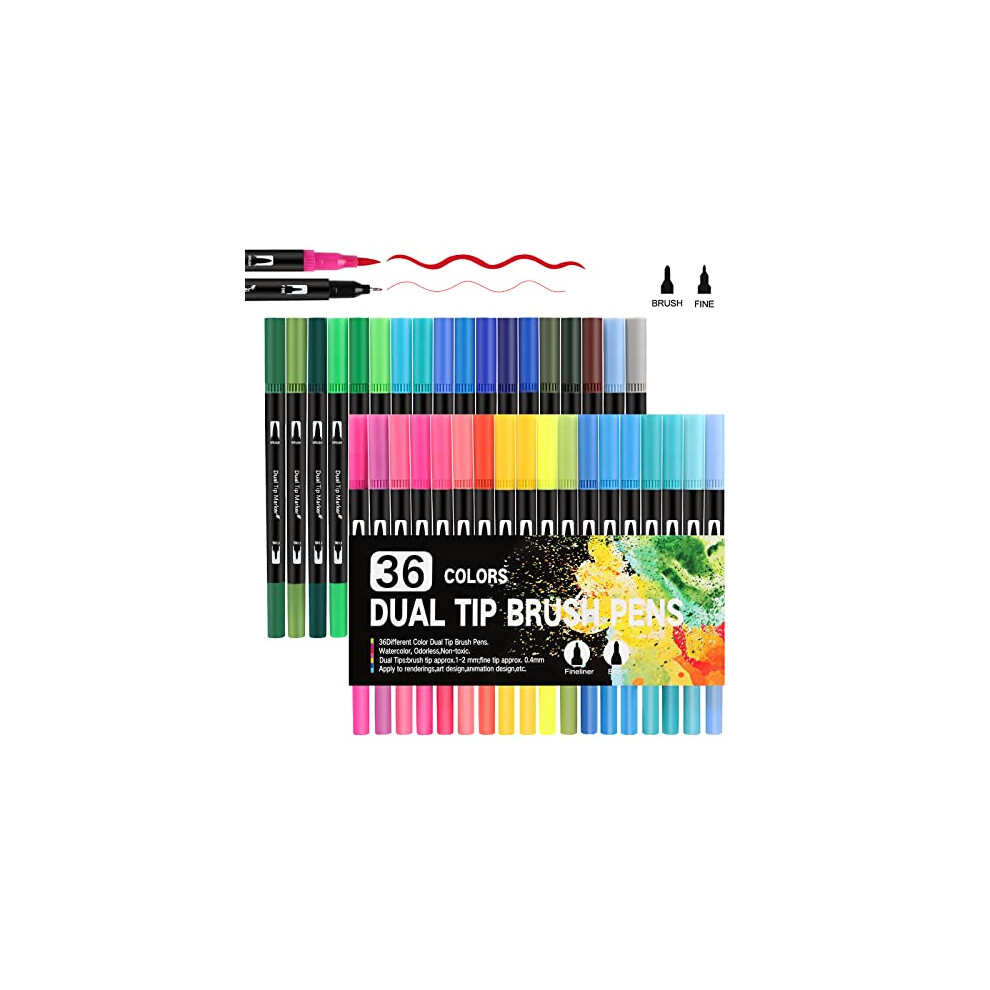 36 Colouring Pens, Dual Tips Brush Fineliner Colored Pens, Water Based Marker for Calligraphy Drawing Sketching Coloring Book Journal Kids Art
