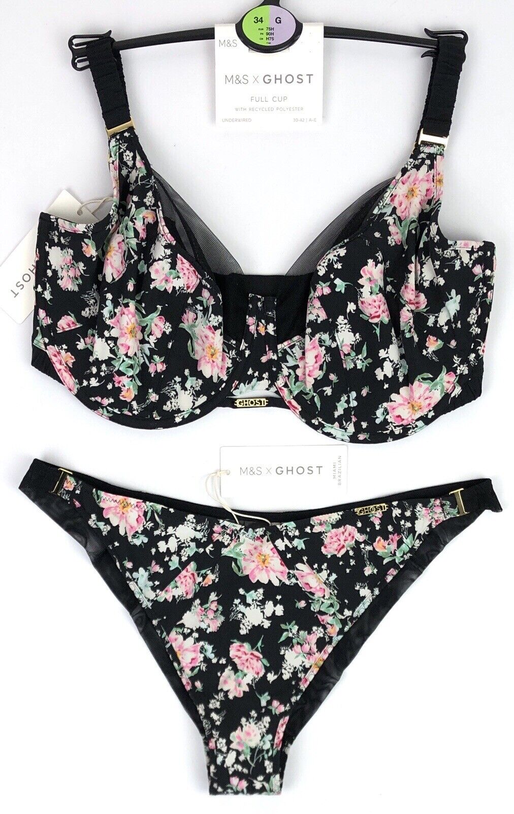 Marks & Spencer Underwired Non Padded Full Cup Bra 34G Knickers UK 12 BLACK BNWT