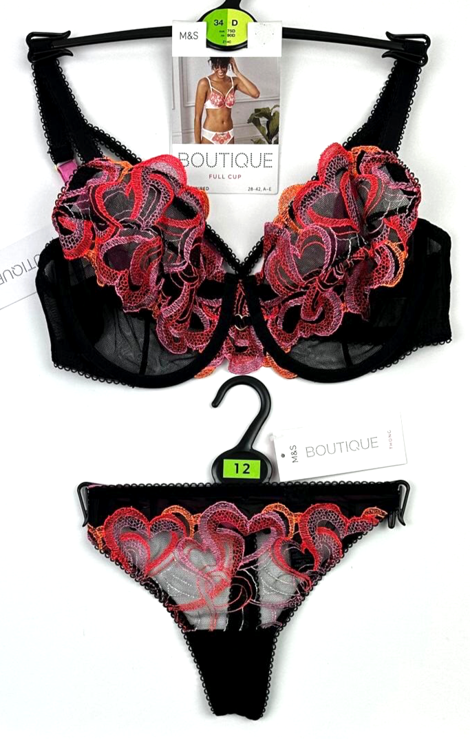 Marks & Spencer Boutique Full Cup Bra 34D & Thong UK 12 BLACK BNWT
