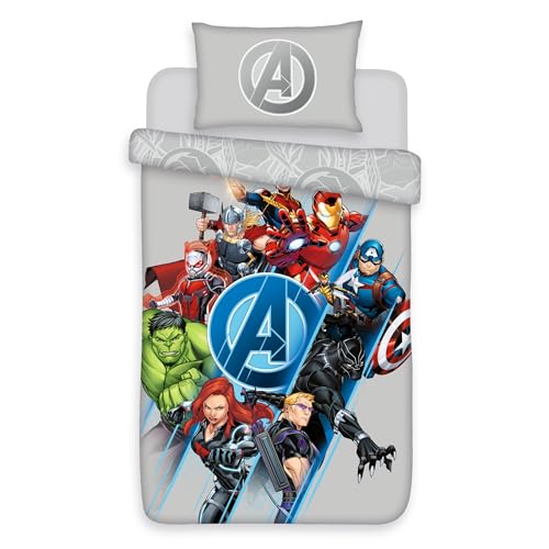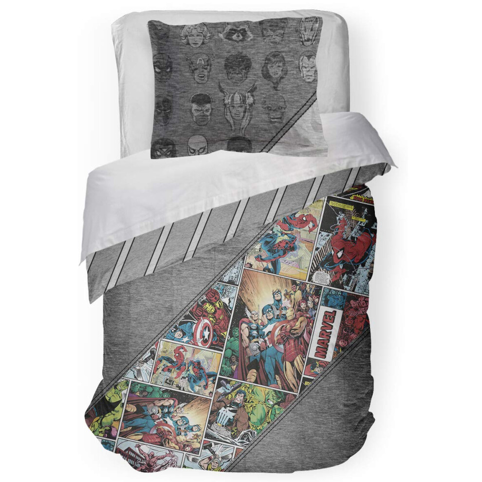 Marvel Avengers Single Duvet Cover Set - Grey Polycotton Bedding with Superhero Characters - 135x200 cm Quilt Cover with 50x75 cm Pillowcase - Kids Bedding Set, Machine Washable, Soft & Durable