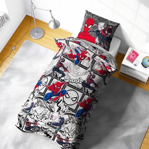 Marvel Spider-Verse Single Duvet Cover | Action-Packed Comic Strip Design | Kids Bedding Set Includes Matching Pillowcase, 100% Polycotton, Red, Black & White,135 x 200cm