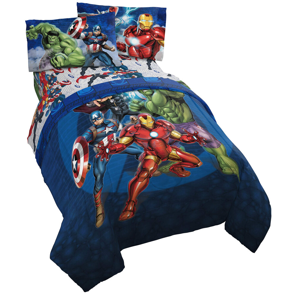 Marvel Avengers Blue Circle 5 Piece Full Bed Set - Includes Reversible Comforter & Sheet Set - Bedding Features Captain America & Iron Man - Fade Resi