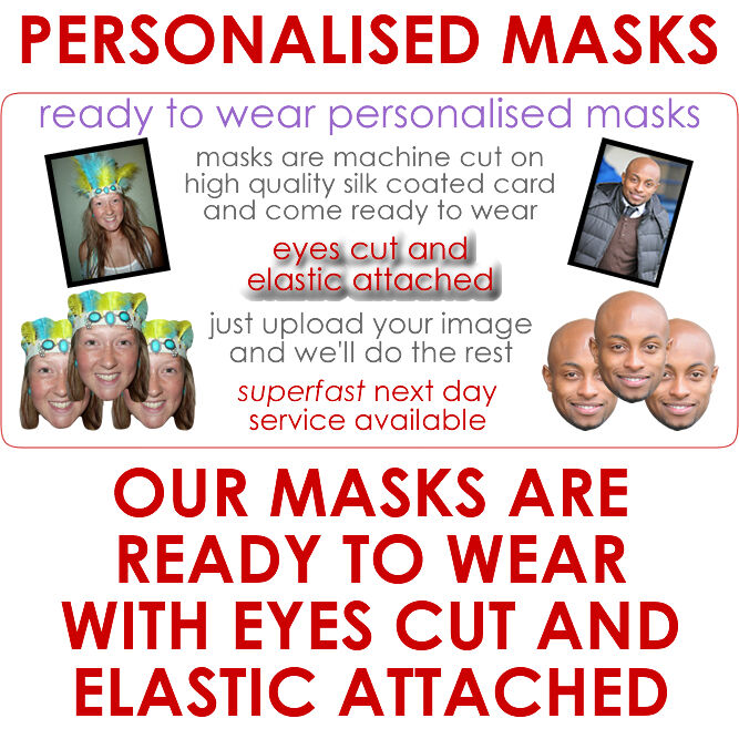 15 Personalised Party Card Face Masks. Elastic Attached, Eyes Cut, Ready To Wear