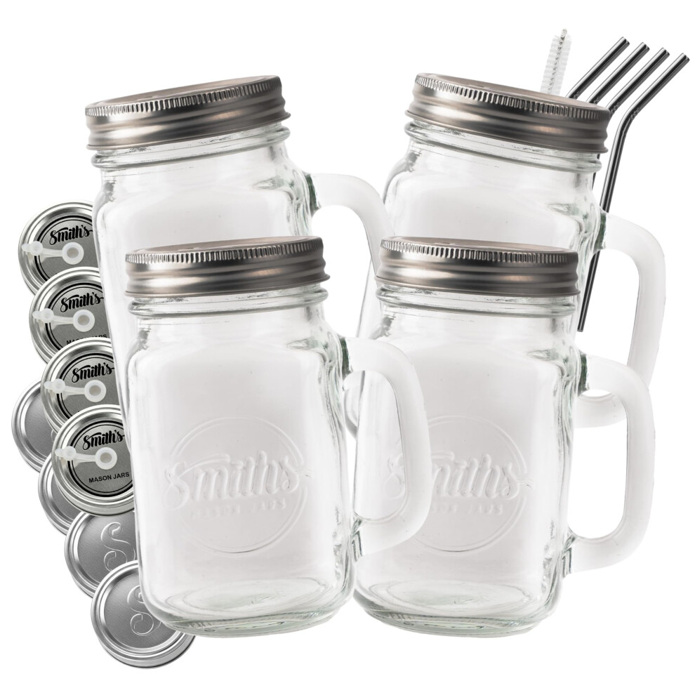 Smiths Mason Jars with Lids and Straws - 16oz/473ml Glass Mason Jar Cups with Handles (4 Pack) - Smoothie Glasses, Overnight Oats Containers, Iced