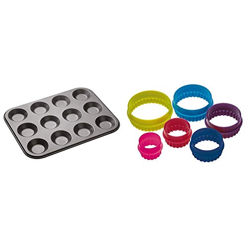 masterclass KitchenCraft 12-Hole Non-Stick Shallow Baking Tray, 32 x 24 cm & Colourworks Plastic Plain and Fluted Round Cookie Cutters, Multi-Colour, Set of Six