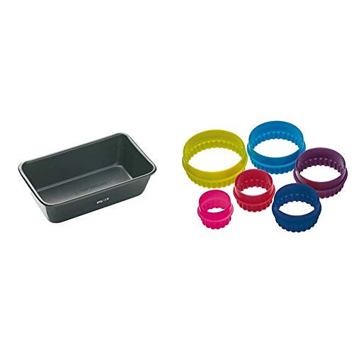 masterclass Non-Stick 2 lb Loaf Tin, 23 x 13 cm (9" x 5") & Colourworks Plastic Plain and Fluted Round Cookie Cutters, Multi-Colour, Set of Six