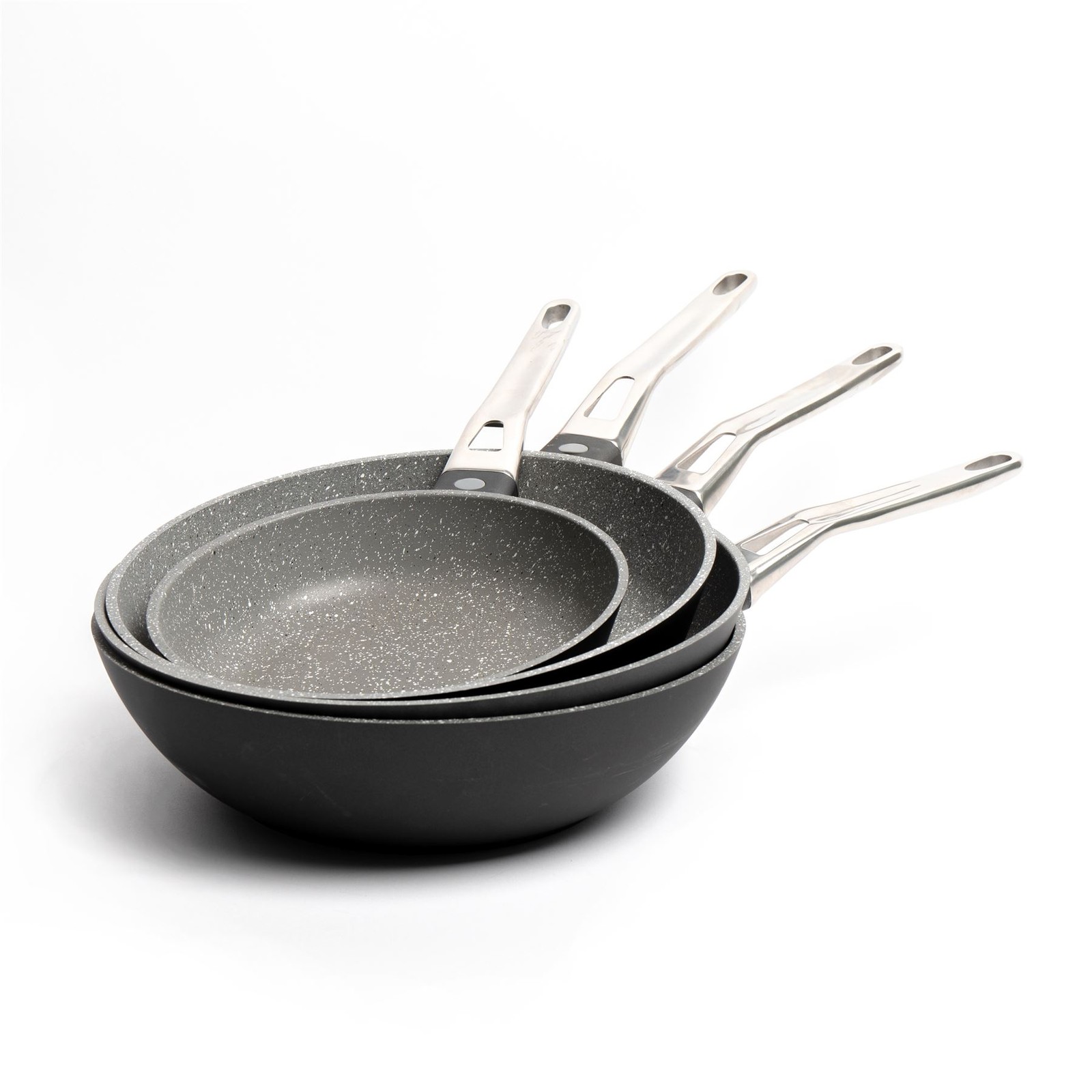 3pc Cookware Set with 2x Non-Stick Cast Aluminium Frying Pans, 26cm & 28cm and a 28cm Wok - Induction Safe