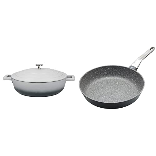 MasterClass MCMSCRD28GRY Shallow Casserole Dish with Lid, Lightweight Cast Aluminium, Ombre Grey, 4 Litre/28 cm & MCMFP28 Cast Aluminium Induction-Safe Non-Stick Frying Pan, 28 cm (11"), Grey