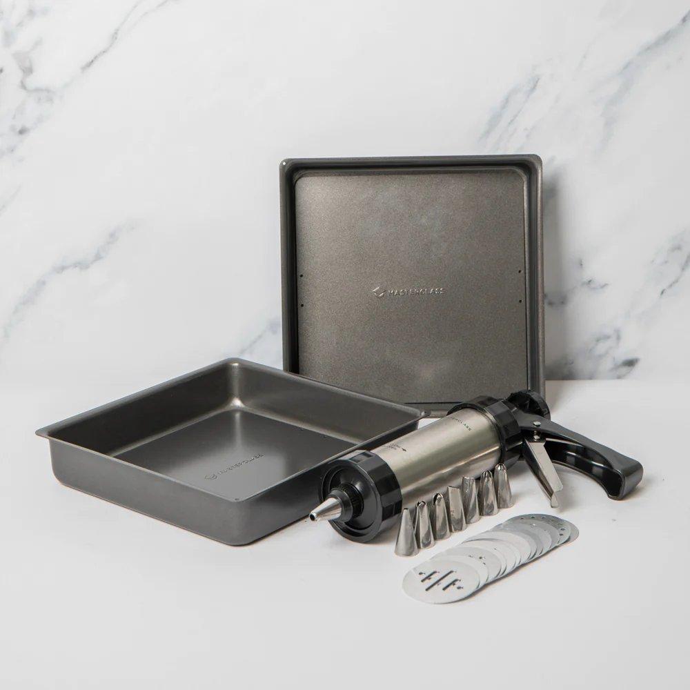24pc Baking Set with 2x Non-Stick Loose Base 20cm Square Sandwich Pans, Icing Gun, 8x Stainless Steel Nozzles and 13x Cutters