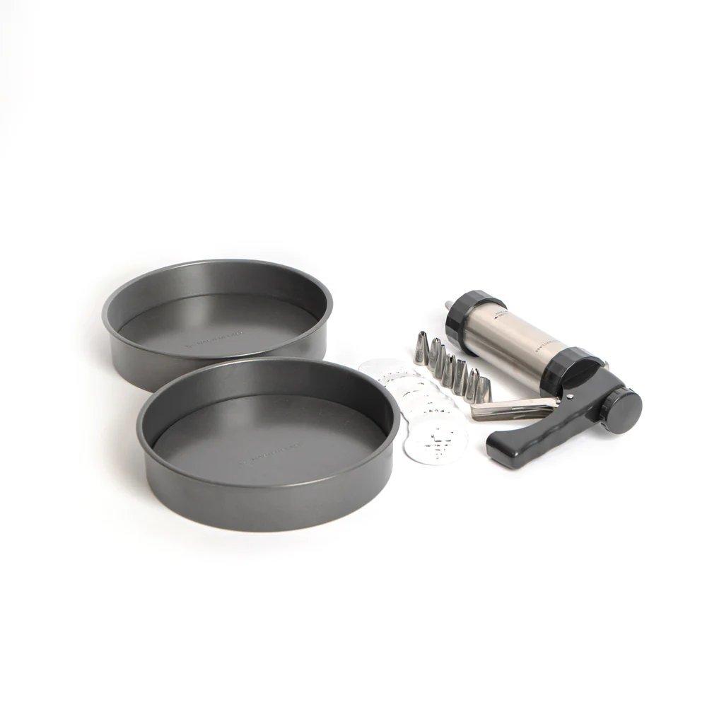 24pc Baking Set with 2x Non-Stick Loose Base 20cm Sandwich Pans, Icing Gun, 8x Stainless Steel Nozzles and 13x Cutters