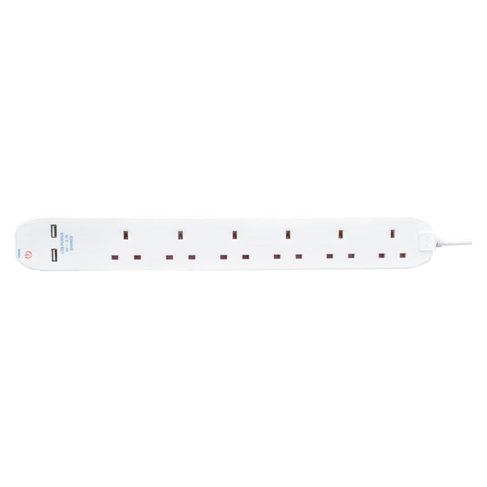 Masterplug 6 Gang Extension Lead with 2 x USB Charging Sockets, 1 Metre, White