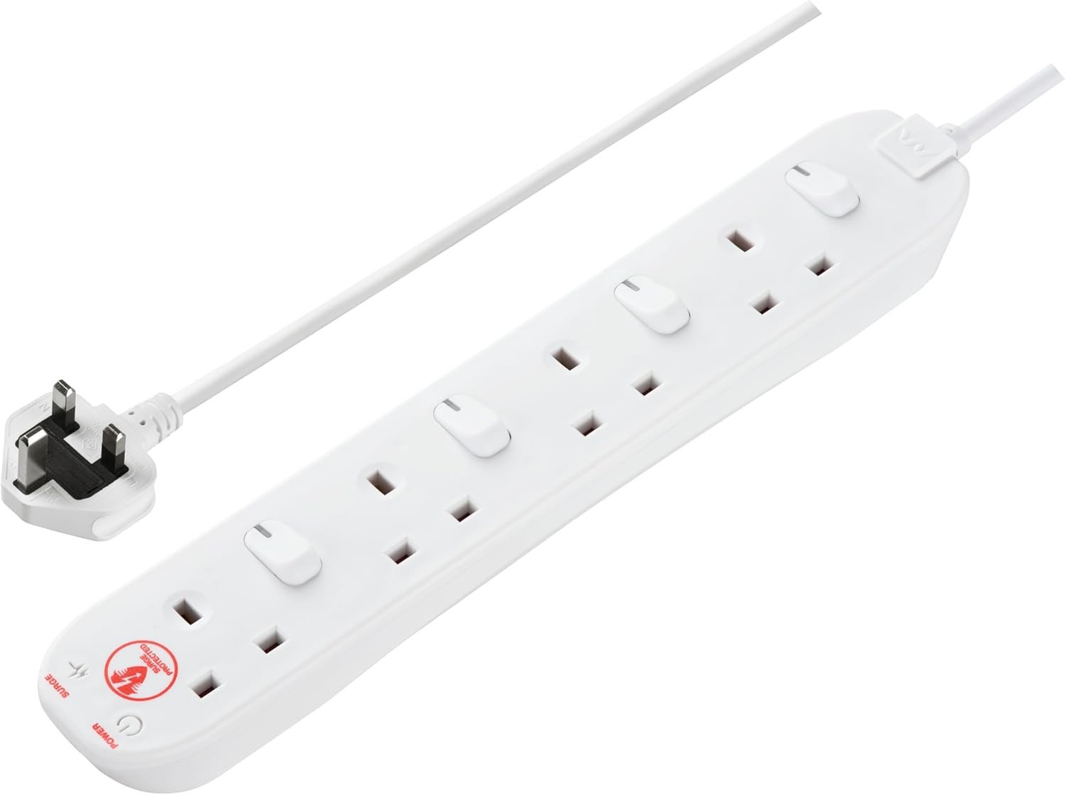 Masterplug Four Socket Extension Lead, 2 Metre Cable, Surge Protection, Individual Switches, Power and Surge LED Indicators, 4-Way Plug Extension Cable, Power Strip, White, 13A, 4G, 2m, SWSRG4210N