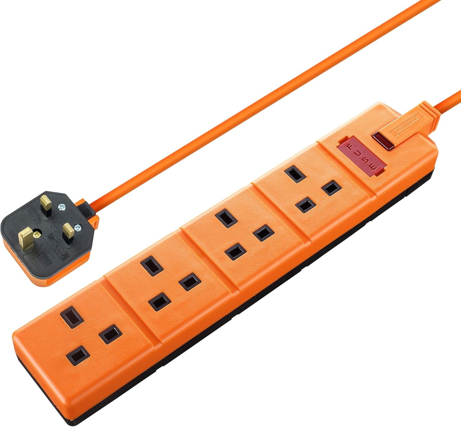 Masterplug Four Socket Extension Lead, 4 Metre Cable, LED Power Indicator, Unswitched, Heavy Duty, Rewireable, Power Strip, Work Power, Permaplug, Orange, 13A, 4G, 4m, EXS1344O