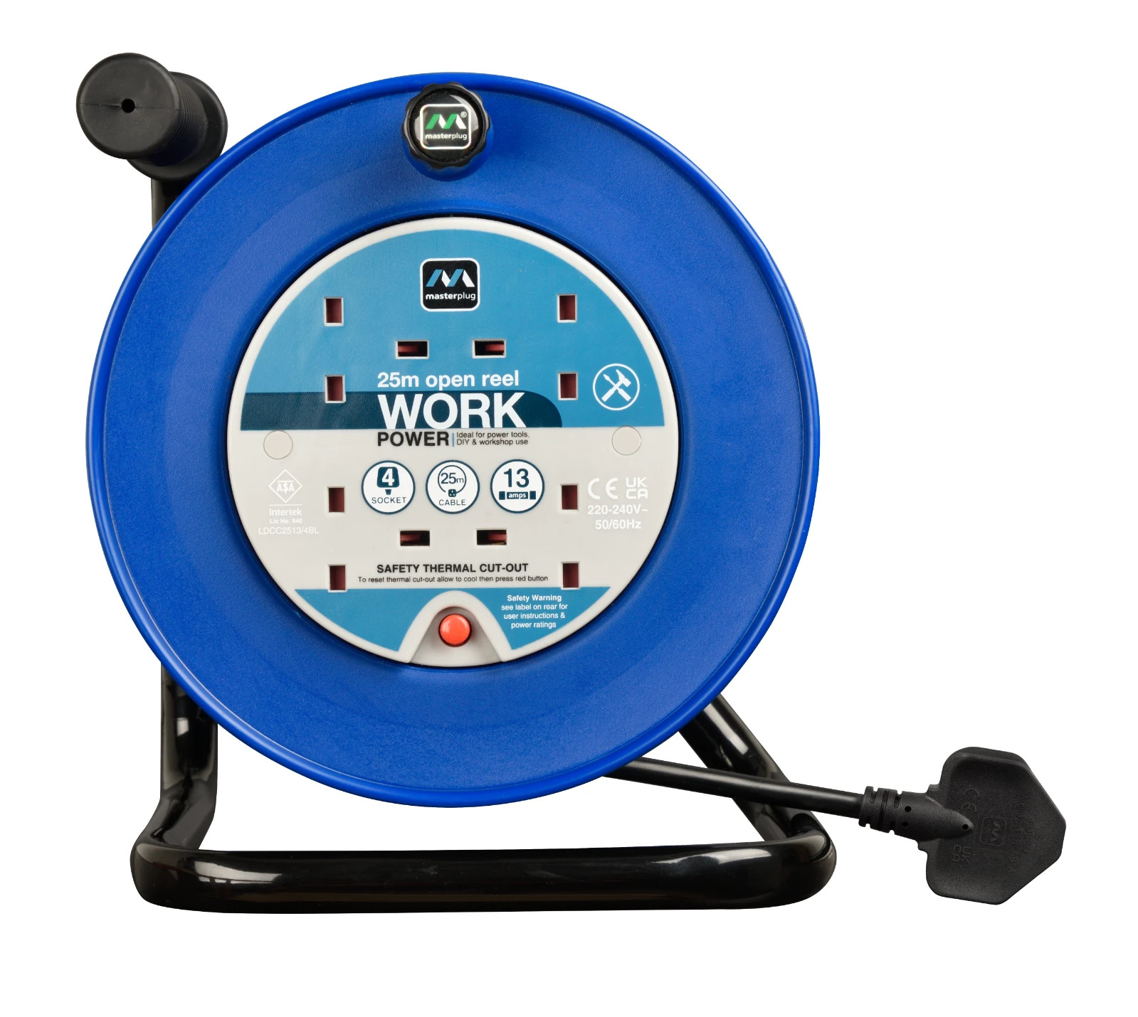 Masterplug 25m Extension Lead Cable Reel 4 Gang Heavy Duty Sockets Blue 13A 240V