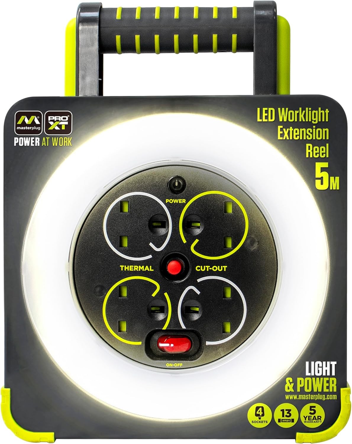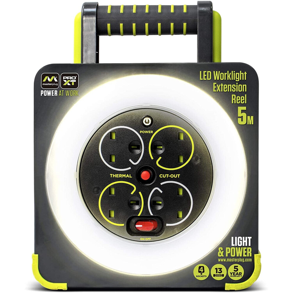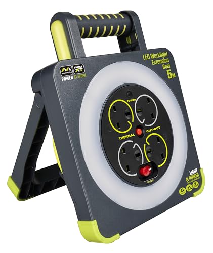Masterplug WLU05134SL-PX Pro-XT Four Socket LED Work Light Extension Reel with Fold Out Stand, Thermal Cut Out and Power Switch, 5 metre High