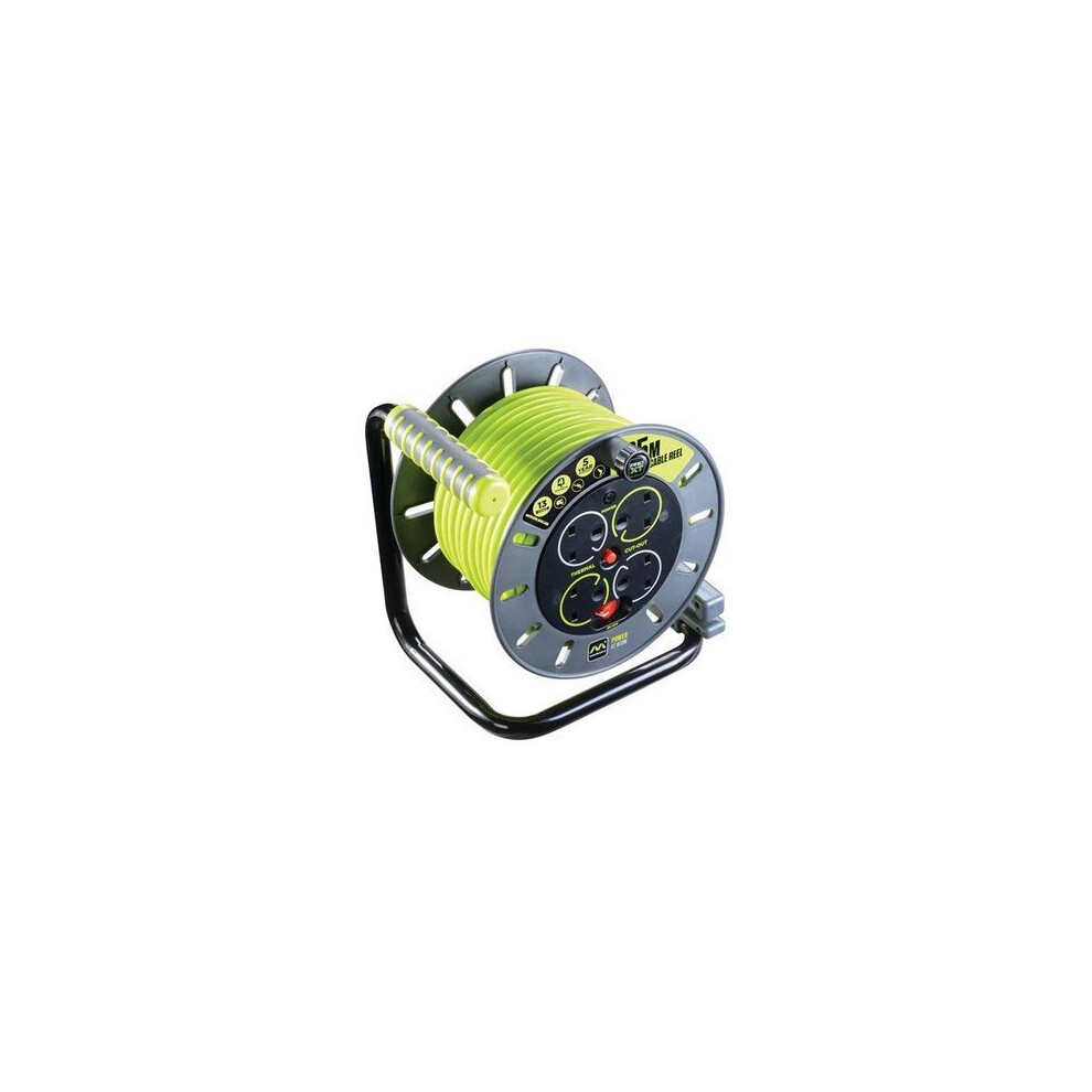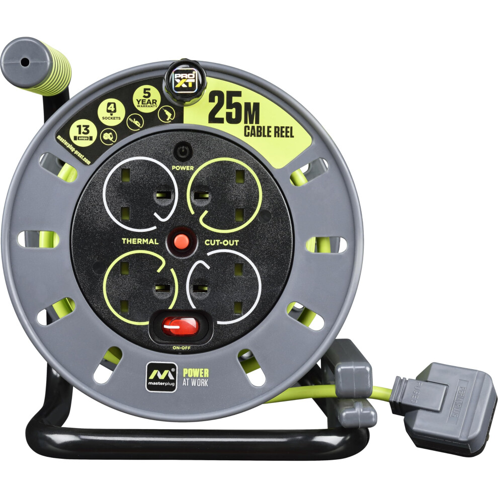 Masterplug Pro-XT Four Socket Open Cable Reel Extension Lead with Winding Handle Thermal Cut Out & Power Switch 25 Metres High Visibility Cable Green