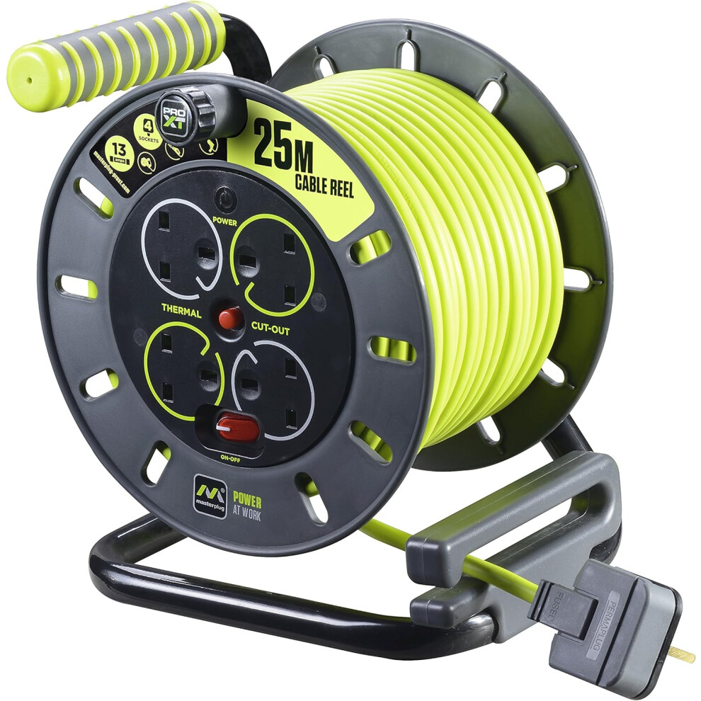 Masterplug Pro-XT Four Socket Open Cable Reel Extension Lead with Winding Handle, Thermal Cut Out and Power Switch, 25 Metres High Visibility Cable,