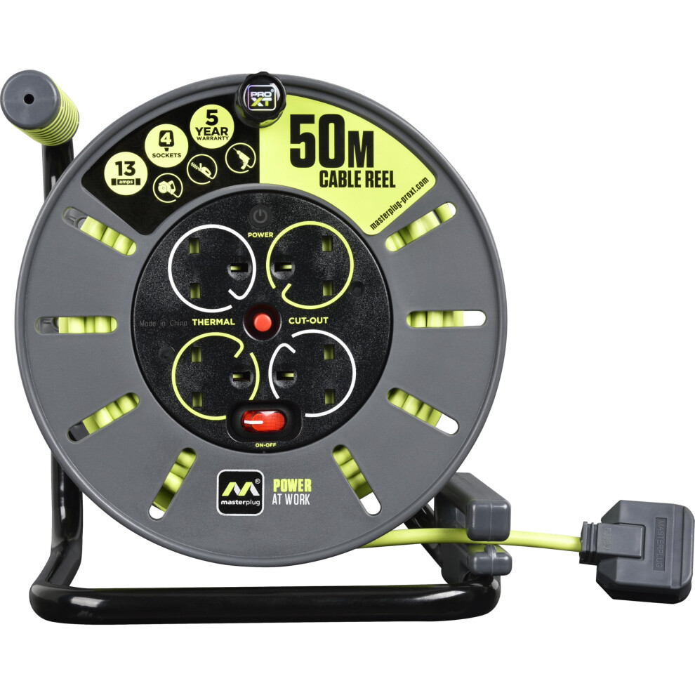 Masterplug OLU50134SL-PX Pro-XT Four Socket Open Cable Reel with Winding Handle, Thermal Cut Out and Power Switch, 50 Metres High Visibility Cable,