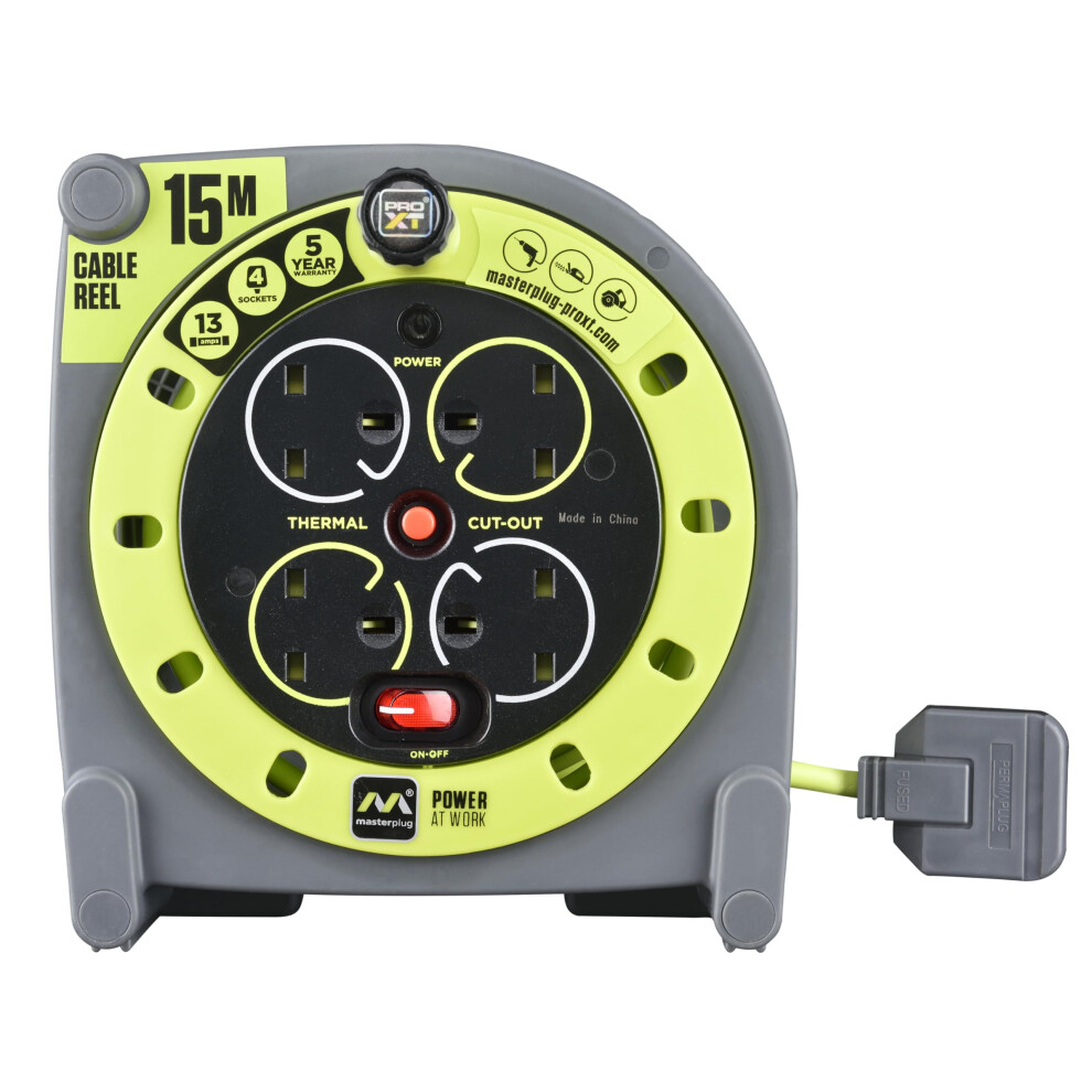 Masterplug Four Socket, 15 Metre Premium Case Reel, Medium Power Cable Extension Reel, Thermal Cut-Out & Power Indicator, Heavy Duty, Pro-XT,