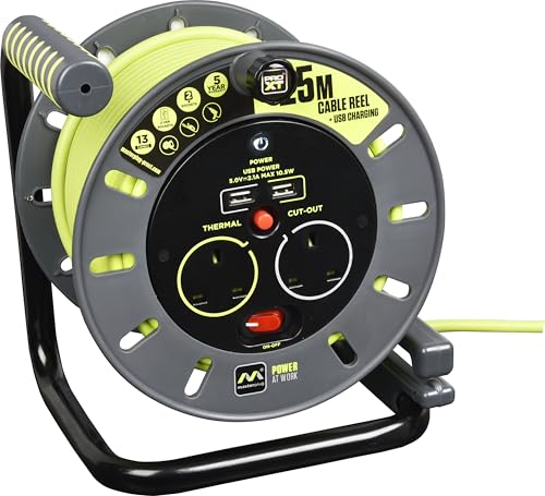 Masterplug OMU25132USL-PX Pro-XT Four Socket Open Cable Reel Extension Lead with Winding Handle and Two USB Charging Ports, Thermal Cut Out and Power Switch, 25 Metres High Visibility Cable, Green