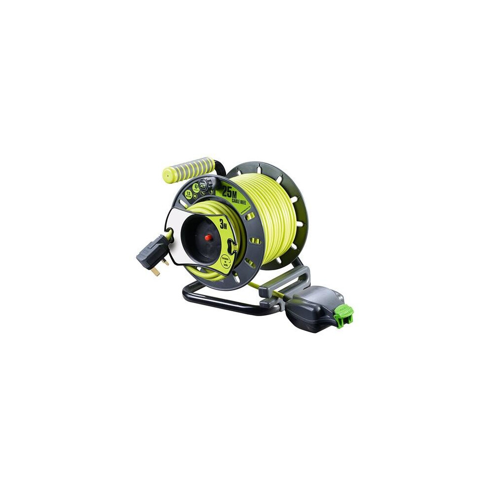 Masterplug Pro-XT Four Socket Open Cable Reel Extension Lead with Winding Handle, Thermal Cut Out and Power Switch, 25 Metres High Visibility Cable, Green