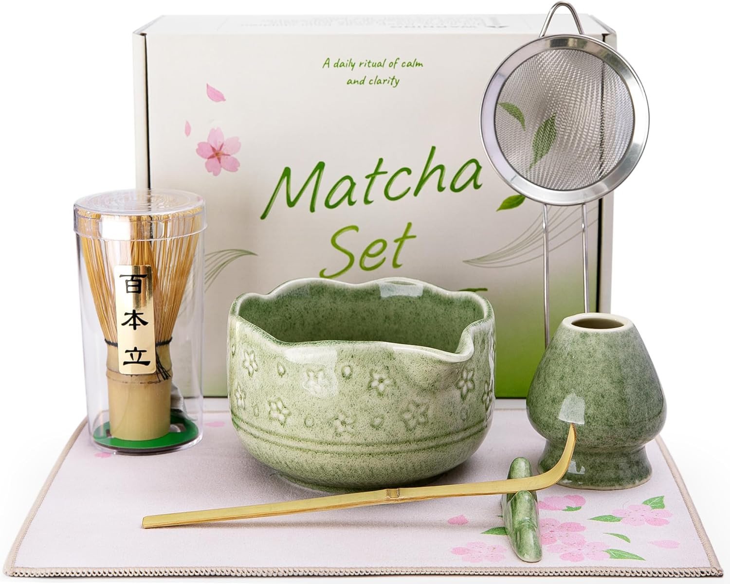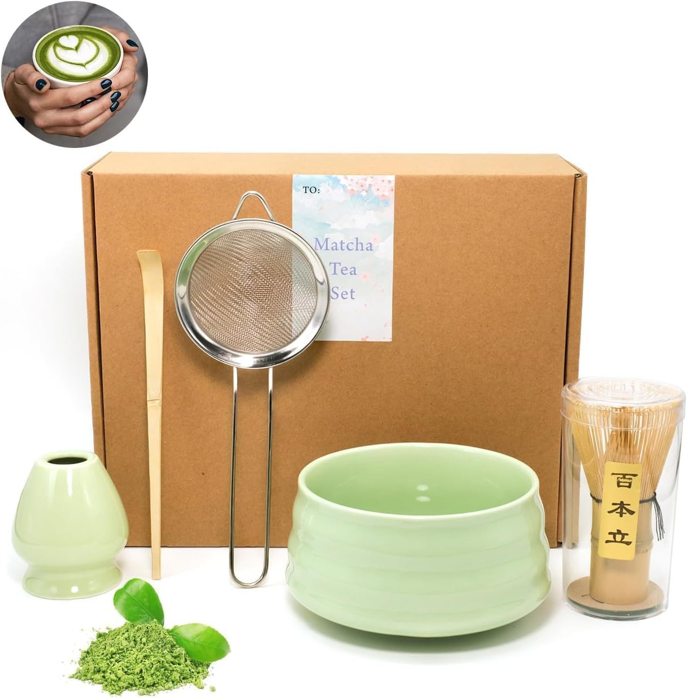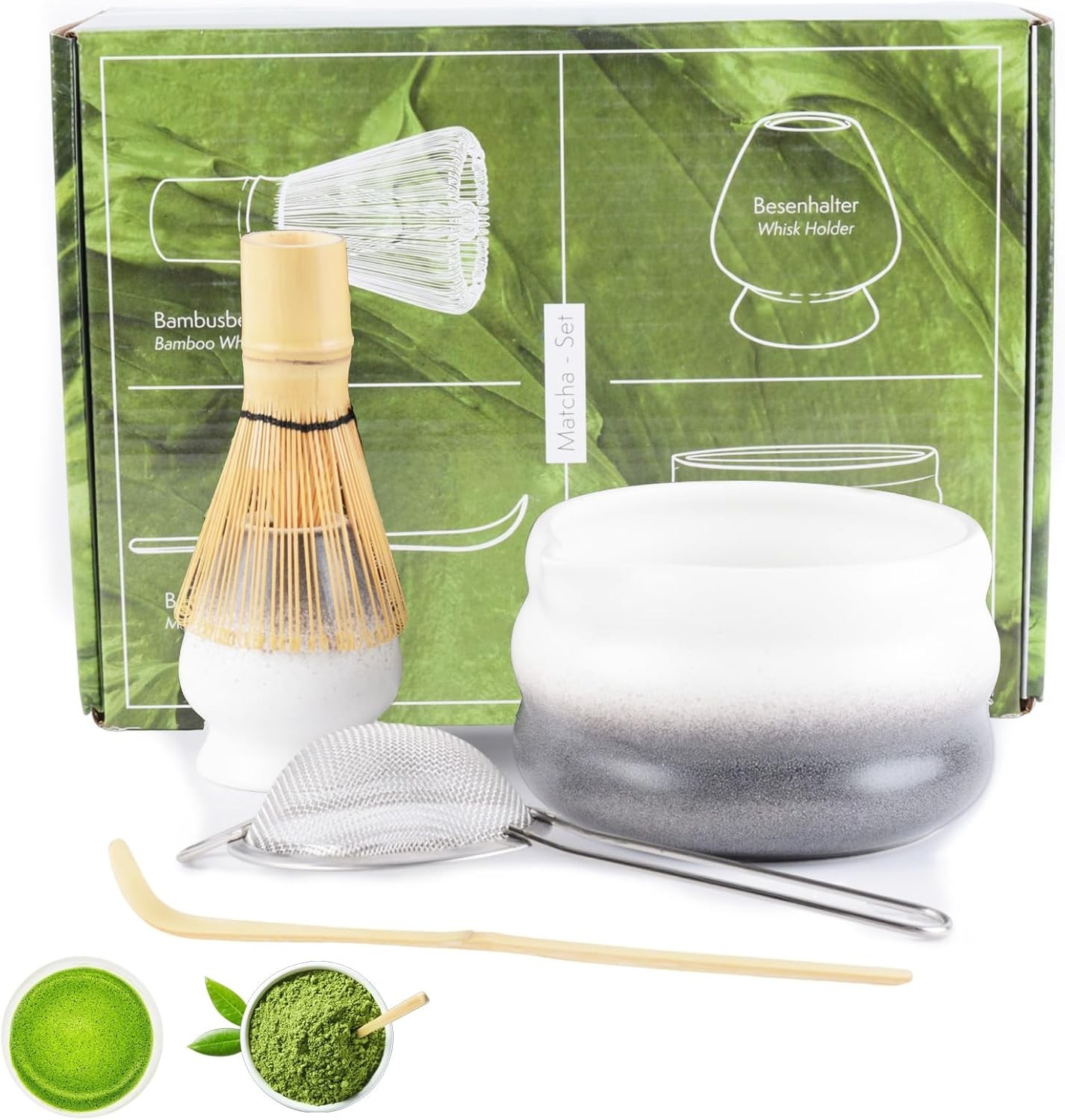 Matcha Kit – 5 Pcs Matcha Whisk Set with Bamboo Whisk & Scoop, Ceramic Bowl & Whisk Holder, and Stainless Steel Strainer – Complete Matcha Kit for Ceremony, Latte & Gift for Green Tea Lovers