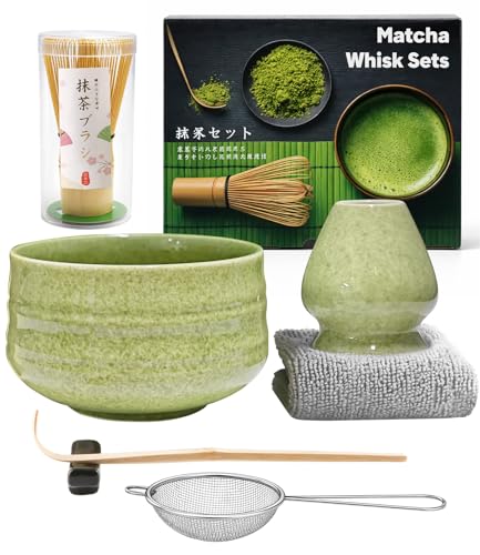 Matcha Set (7-Piece) Which Matcha Whisk, Matcha Cup, Matcha Bowl, Chasen, Matcha Sieve, Matcha Spoon,Ideal Starter Matcha Kit for Easy Matcha Making (Green)