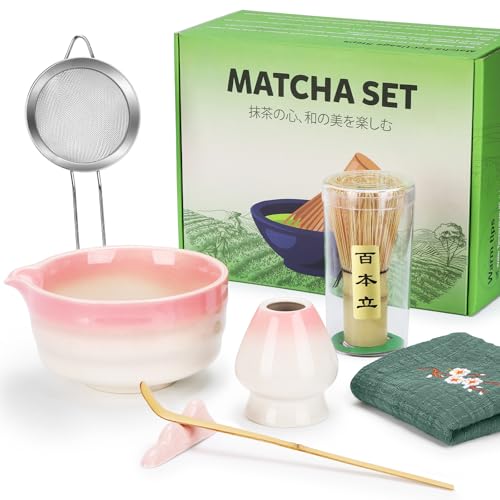 Matcha Set (7-Piece) Which Matcha Whisk, Matcha Cup, Matcha Bowl, Chasen, Matcha Sieve, Matcha Spoon,Ideal Starter Matcha Kit for Easy Matcha Making (Pink White)