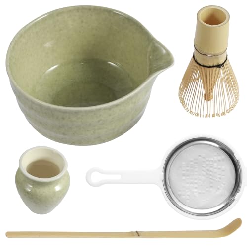 MestectPET Matcha Whisk, 5 Pcs Matcha Tea Set Includes Porcelain Bowl with Pouring Spout, Spoon, Matcha Whisk and Porcelain Holder, Sifter, Matcha Gift Set for Beginners and Enthusiasts (Green)
