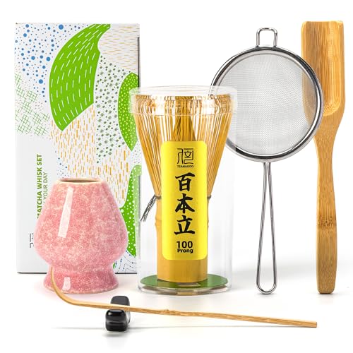 TEANAGOO Matcha Whisk Set,Matcha Whisk (100 prongs) with Pink Holder,6-PCS Traditional Starter Set,Scoop (Chashaku),Tea Spoon,Bamboo Chasen for Making Latte,Ceremony Accessory,Gife for Friend/Family