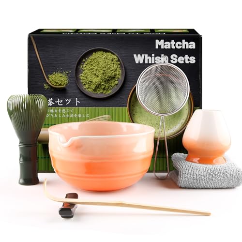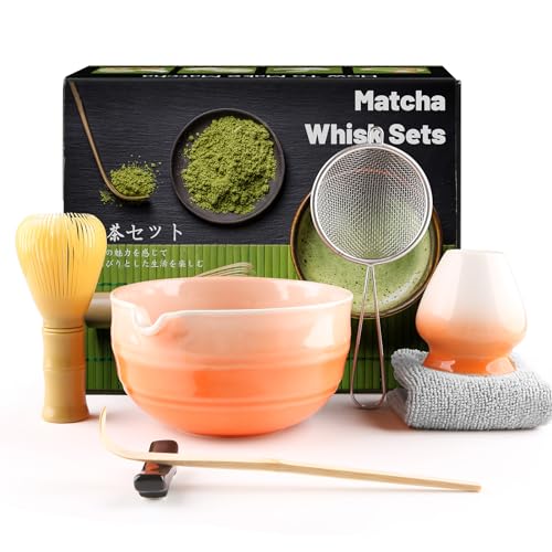 Matcha Set (7-Piece) Which Matcha Whisk, Matcha Cup, Matcha Bowl, Chasen, Matcha Sieve, Matcha Spoon,Ideal Starter Matcha Kit for Easy Matcha Making (Orange White)