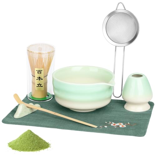 Maestri House Matcha Whisk Set, 7 Pcs of Ceramic Matcha Kit, Includes Matcha Bowl, Matcha Whisk and Holder, Tea Scoop, Scoop Rest, Steel Sifter and Tea Cloth - Gift for Matcha Lovers and Family-Green