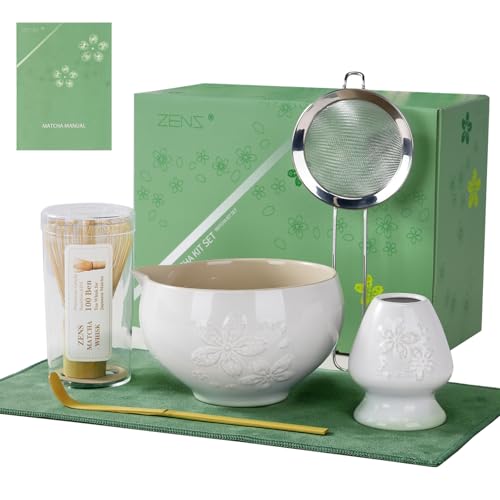 ZENS 6pcs Matcha Set, Matcha Whisk, Matcha Making Kit with Green Sakura Bowl & (Chasen Holder), Bamboo Scoop, 304 Sifter, Tea Mat for Japanese Matcha Tea Ceremony
