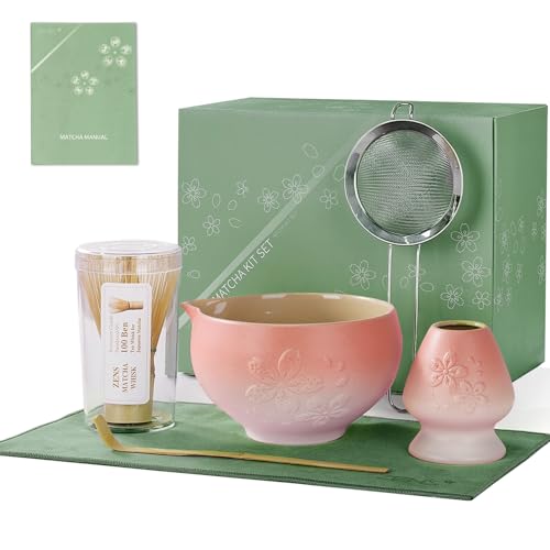 ZENS Matcha Set, 6pcs Pink Matcha Kit with Bamboo Whisk, Matcha Making Set with Sakura Bowl & (Chasen Holder) Scoop, 304 Sifter, Tea Mat, Tea Ceremony Kit for Matcha Latte