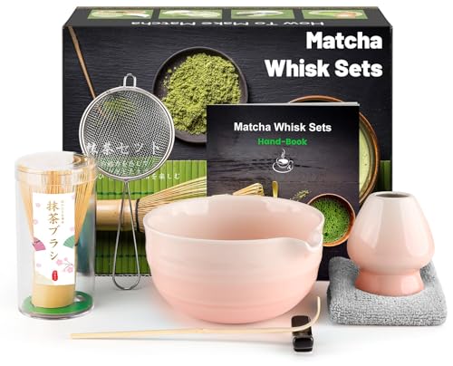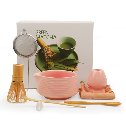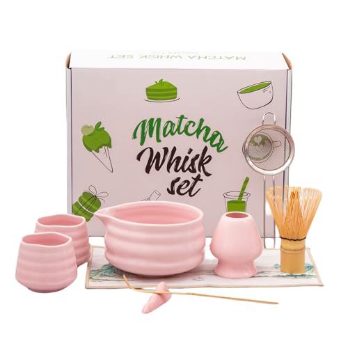 Maestri House Matcha Whisk Set, 7 Pcs of Ceramic Matcha Kit, Includes Matcha Bowl, Matcha Whisk and Holder, Tea Scoop, Scoop Rest, Steel Sifter and Tea Cloth - Gift for Matcha Lovers and Family-Pink