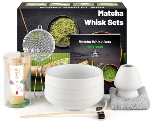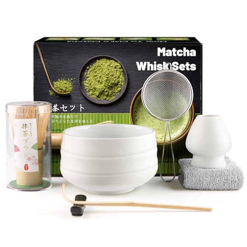 Matcha Set (7-Piece) Which Matcha Whisk, Matcha Cup, Matcha Bowl, Chasen, Matcha Sieve, Matcha Spoon, Ideal Starter Matcha Kit for Easy Matcha Making (White Green)
