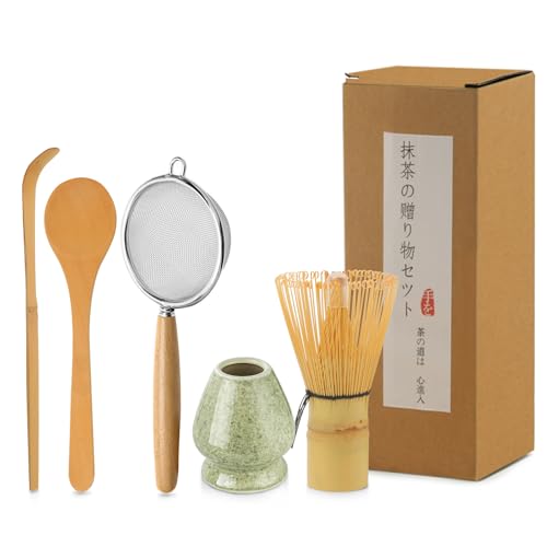 Japanese Matcha Set for Tea Lovers: GEEKHOM 5PCS Matcha Kit with Bamboo Whisk, Whisk Holder, Matcha Scoop, Spatula Spoon, Sieve - Gift for Lovers Beginners Traditional Tea Ceremonies