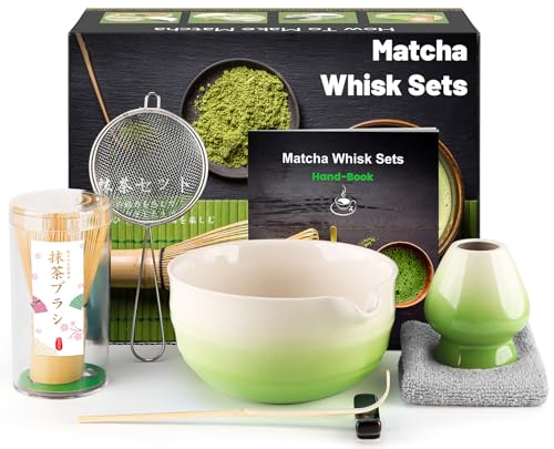 Matcha Set Whisk and Bowl Kit, Matcha Tea Set Gift Includes Ceramic Bowl with Pouring Spout, Bamboo Spoon, Sifter, Bamboo Whisk and Broom Holder, for Beginners and Enthusiasts