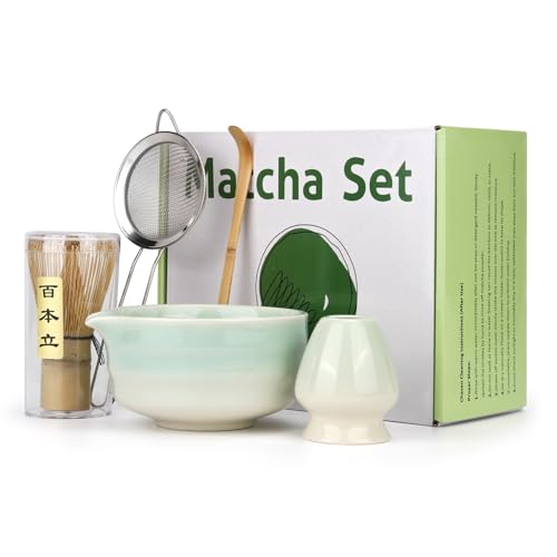 Spesh Matcha Whisk Set 5 PCS Japanese Matcha Tea Set Includes Ceramic Bowl, Bamboo Whisk, Whisk Holder, Sifter and Spoon Teaware Gift for Matcha Lovers and Tea Ceremony Fans(Gradient Green)