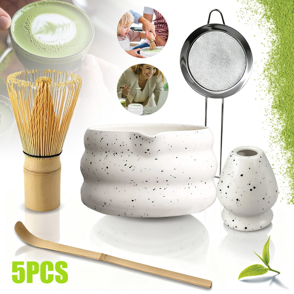 Joiish Matcha Set, Matcha Kit 5-PC, Ceramic Matcha Bowl with Spout & Holder, Bamboo Whisk, Sifter, Scoop, Traditional Matcha Tea Making Tools, Complete Gift Set