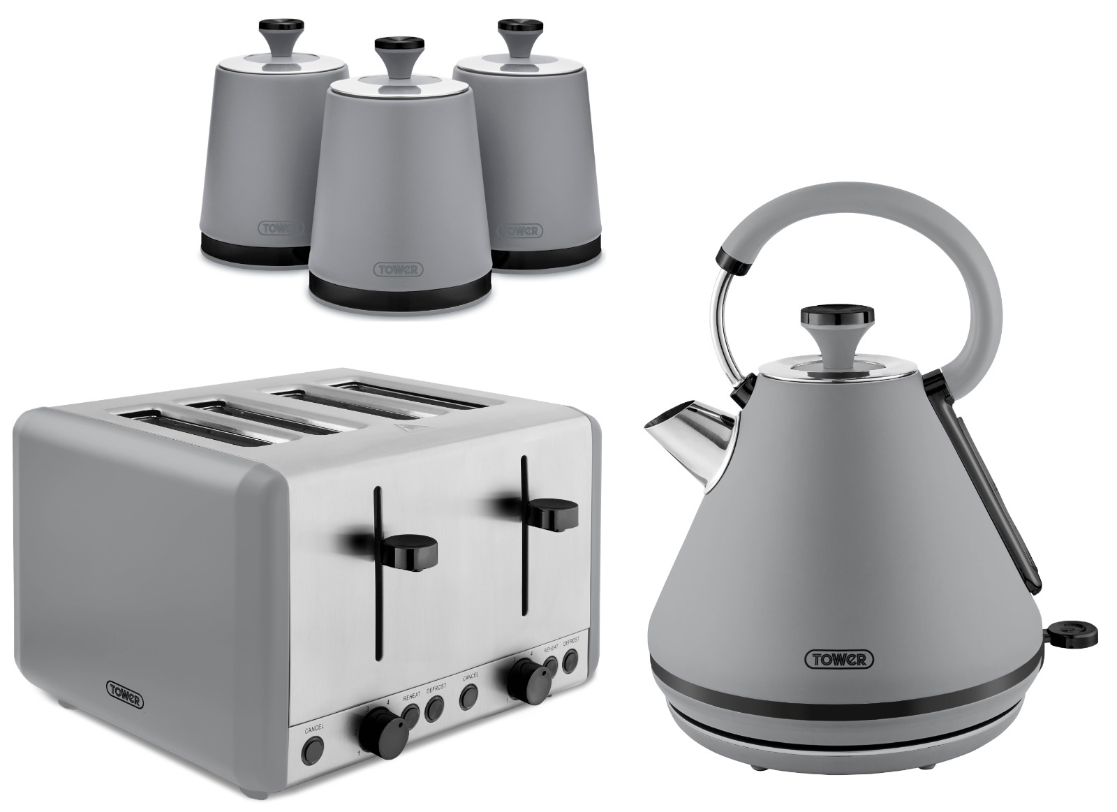 Tower Sera Grey Pyramid Kettle 4 Slice Toaster & Canisters Matching Kitchen Set