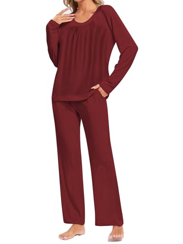 Famulily Pj Sets for Women Ladies Comfy Leisure Suits Round Neck Nightshirt Elastic Waistband Pants 2 Piece Matching Pajamas Wine XL