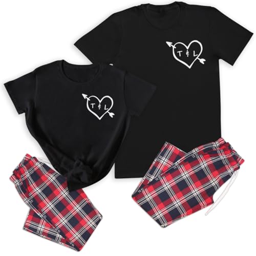 Personalised Heart Arrow & Initials - Couples Matching Pyjamas - Top & Tartan PJ Bottoms - (Sold Separately) Black