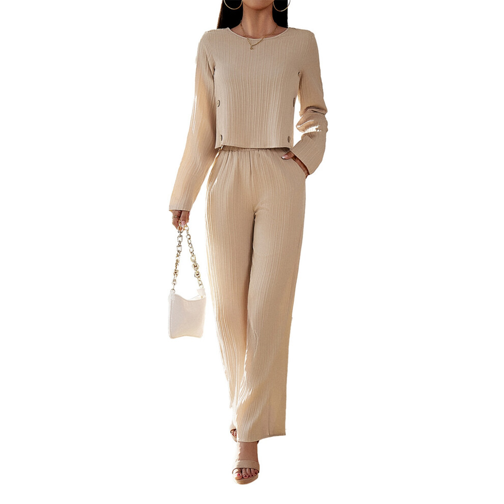 Comfortable Loungewear Set For Women Waffle Knit2Piece Matching Pj Sets With Long Sleeve Top Curved Foot Mouth Design Soft Elastic Waist Breathable