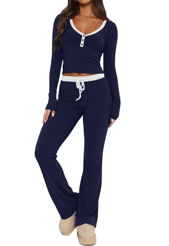LACOZY Sweat Suits for Women 2 Piece Long Sleeve V Neck Pj Set Ribbed Pajama Set Slim Fit Workout Matching Set Navy Blue Small